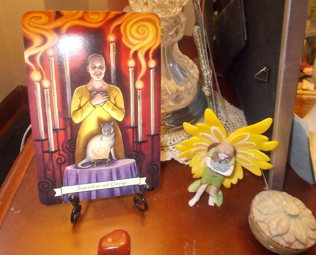 Message: ” If you get this card, you are probably in need of either inspiration and courage, or possibly both. That’s okay because this card is telling you that it’s out there. Or maybe waiting inside of you. If it is inspiration that you need, look to the natural world that surrounds you. It is full of wonders. But don’t forget to look inside you too. The human mind is an amazing place, filled with ideas and possibilities that few of us explore fully. If courage is what you seek, you may discover a core of inner strength you never knew existed. But don’t forget to let others encourage you and reach out to elemental forces of the universe: spiritual beliefs no matter what they are , can be a great source of both inspiration and courage if you remember to call on them when you need them.”
