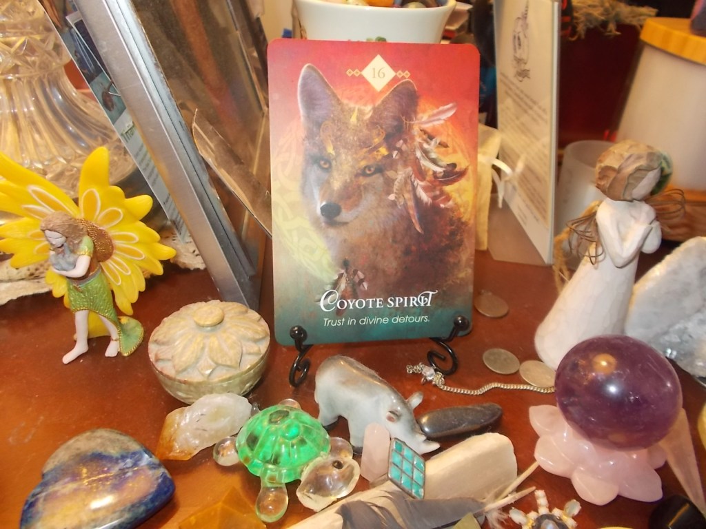 Message: ” Do you find that you are being lead on a strange detour in your life right now? Do you feel that you are being tricked? Coyote’s animal trickster energy is designed to bring you into situations that will teach you lessons you have forgotten to learn. Coyote spirit reminds you to laugh about unexpected twists , to develop humility and gratitude while releasing your attachments to the form of your desires. Trust in divine order now. Coyote spirit is a divine helper: no matter what seems to go astray, things are exactly what they are suppose to be.”