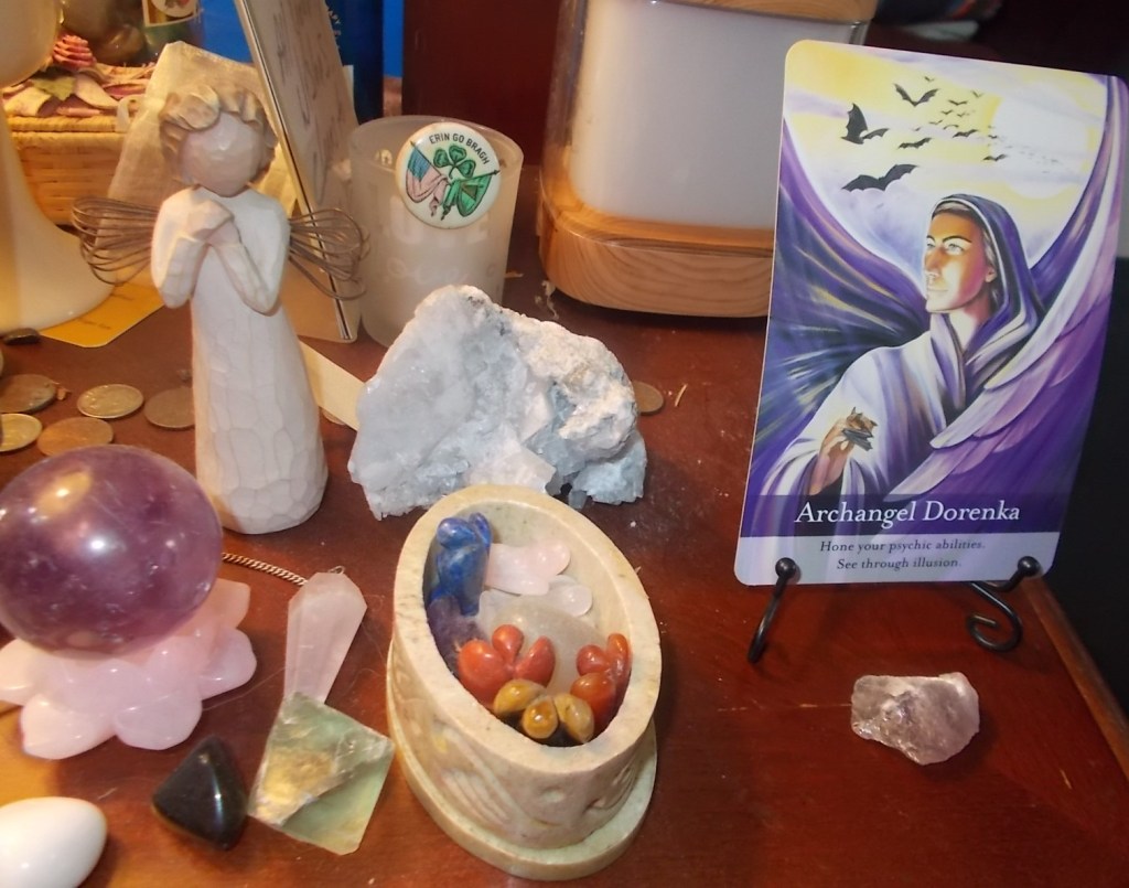 Message: ” This card guides you to open up to your psychic abilities that are latent within you. To do this, expand your right brain by listening to your intuition and trusting your inner guidance. Practice choosing with your heart rather than your left brain. Focus on your throat chakra , your spiritual centre of truth , and visualize a upward-pointing triangle within it. This opens it up to allow Archangel Dorenka and Archangel Michael to pour sacred geometric codes into it. Be aware of those angel sonics and know that your psychic abilities are being honed.