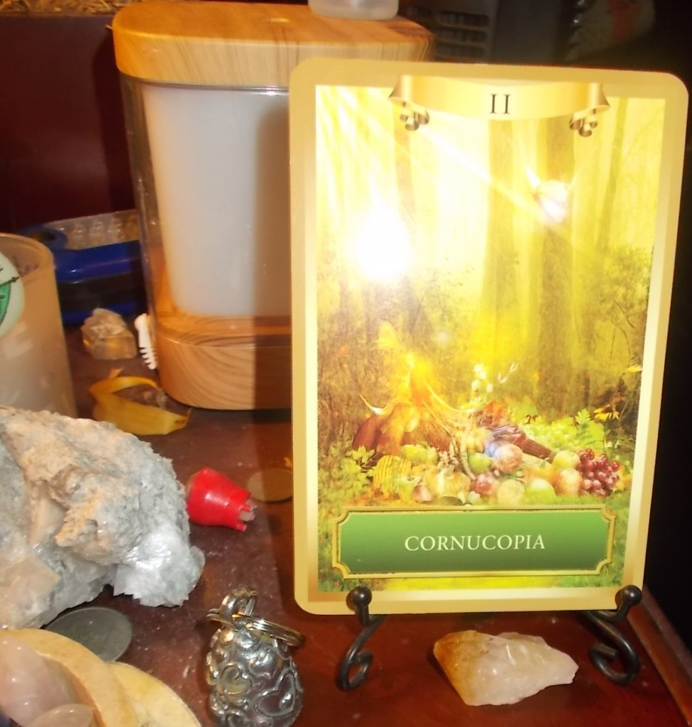 Message: ” Wishes Fulfilled. An abundant harvest and great blessings are waiting for you, and you may even find all your wishes fulfilled. This cornucopia of gifts from the Universe can come in the form of financial riches, job fulfillment , romantic love or all of the above. When you receive this card, you know that you have done important work. It’s about to pay off.”