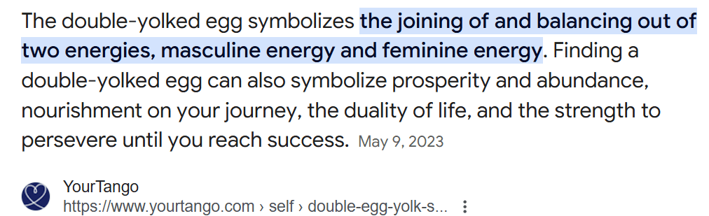 I’ve been getting repeating signs lately. One is of the double yoke egg when I make my breakfast. I thought this would be fun to look up it’s meaning.