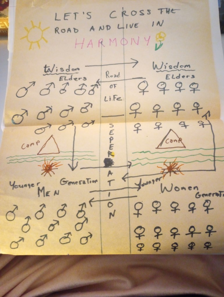 I’ve always kept a copybook of things, recollections, intuition, spiritual research, dreams and poetry of mine, tarot/ oracle readings etc. I was going through my old book and found this drawing from January 2014. As you can see, it goes through the generations of people both male and female. It draws a road / lane of separation between the two and beakons ” Let’s Cross the Road and Live in Harmony.”