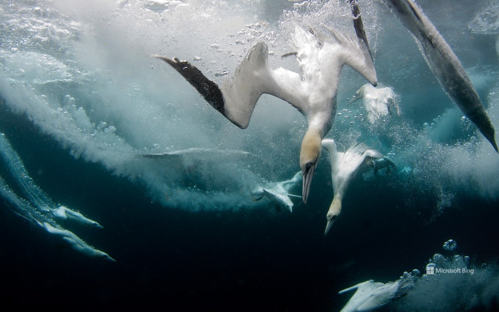 Northern gannets diving for fish, Shetland Islands, Scotland